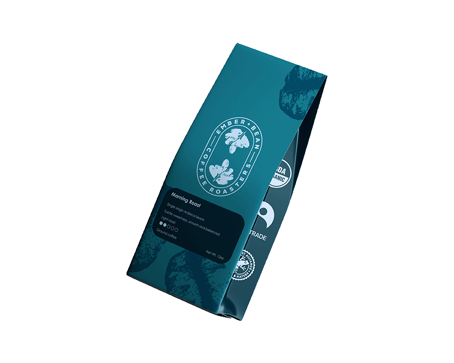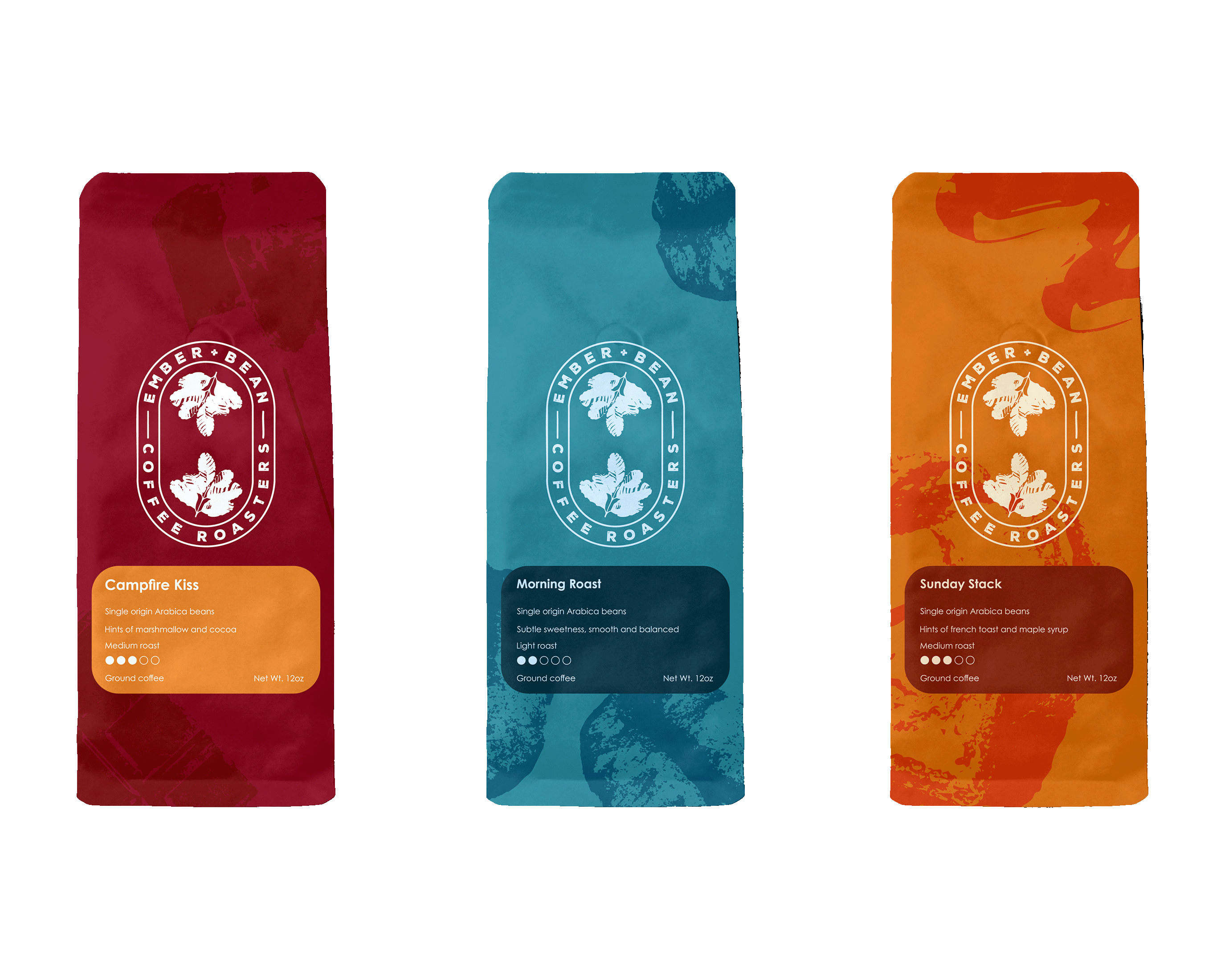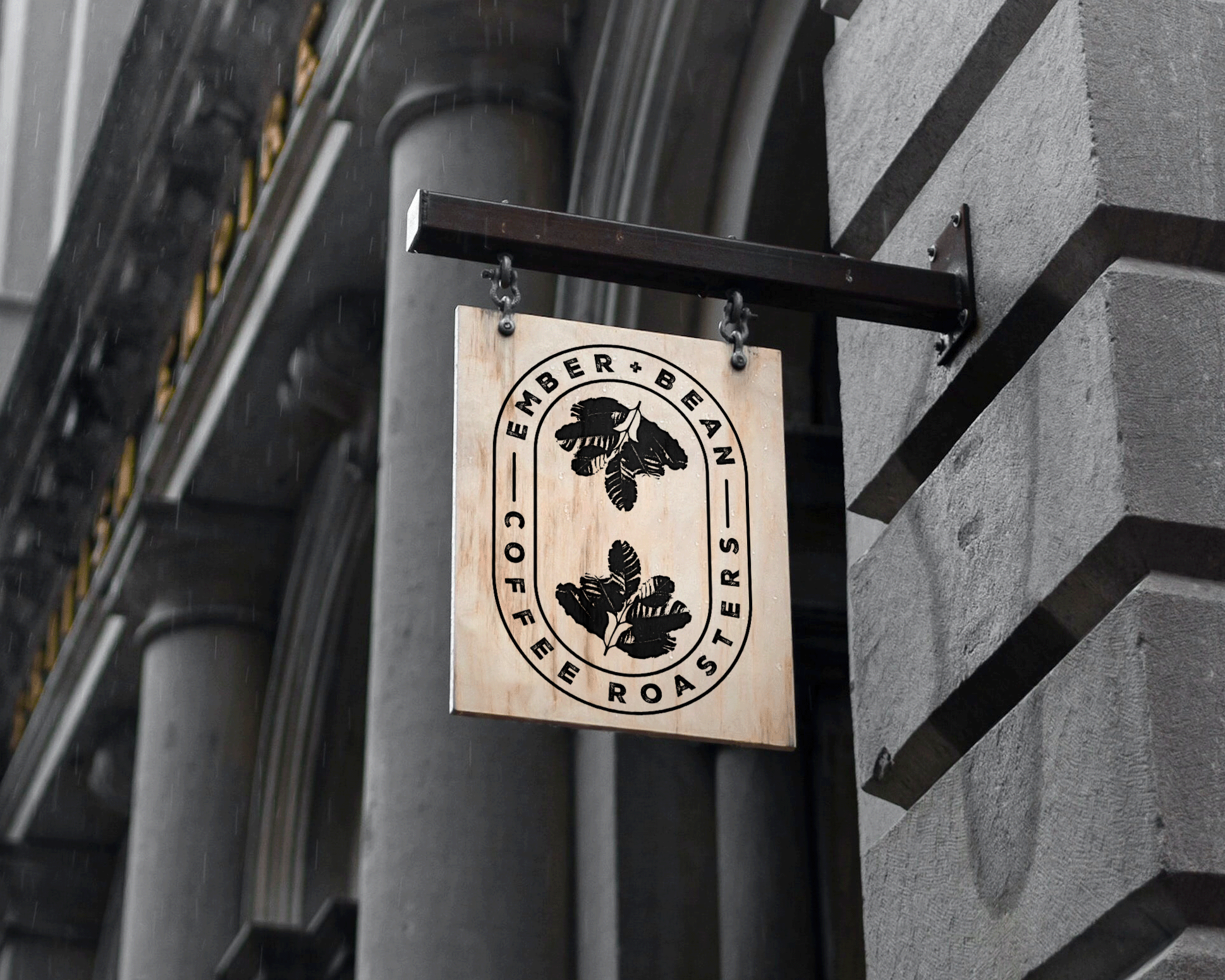 The logo for Ember and Bean Coffee Roasters evokes warmth, craftsmanship, and a connection to the origin of every bean. Built around an ovular, badge-style design, the logo features two central coffee plant leaves as a nod to the agricultural roots of coffee and the brand's commitment to quality sourcing.